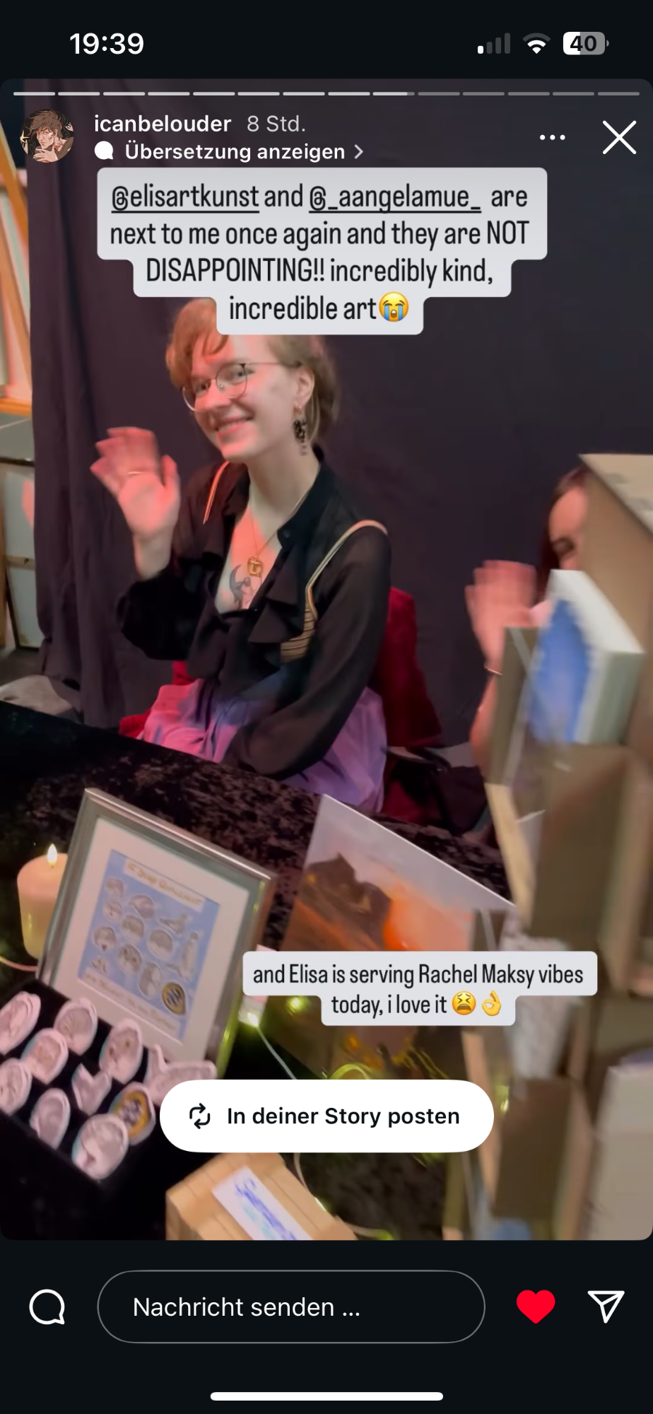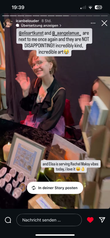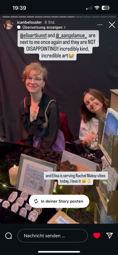 Wenn auch nicht mehr so erfolgreich wie im letzten Jahr, ist die Community der Art-Days immer noch das Beste. Die gegenseitige Unterstützung und Motivation bedeutet ganz viel, wenn ansonsten den ganzen Tag nur ein Zombiestrom an desinteressierten Menschen an einem vorbeiläuft. Ich hatte ganz viel Spaß mit meinen Standnachbar/innen.